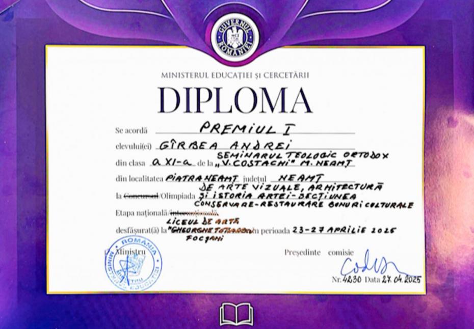 • Andrei Gîrbea, clasa a XI-a, Premiul I – conservare-restaurare